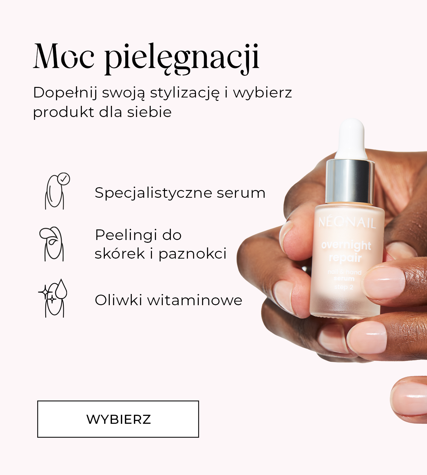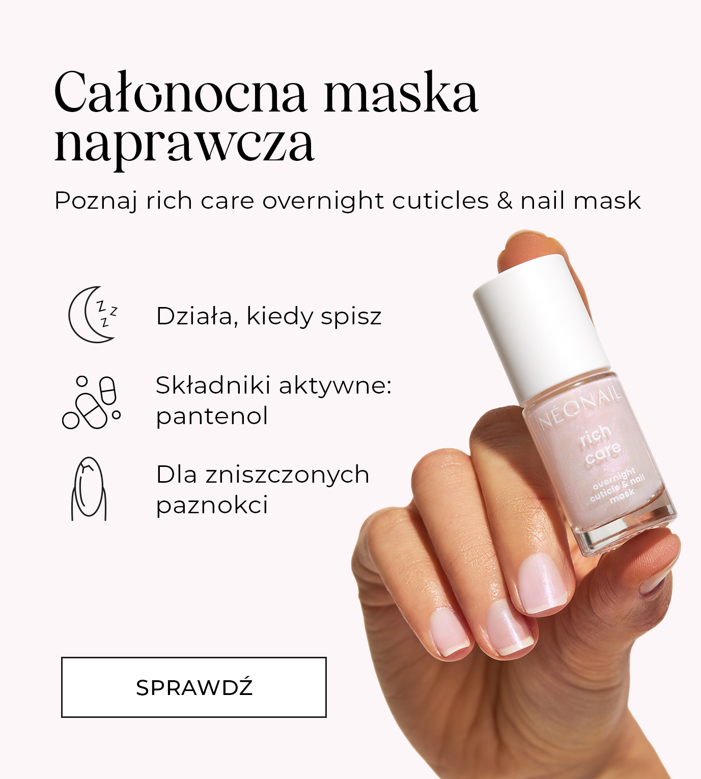 Poznaj nowe produkty do pielęgnacji paznokci i skórek wzbogacone o składniki aktywne, które działają. Odżywki 3w1 rescue glow tint z ceramidami, maska rich care overnight cuticle & nail mask z pentanolem oraz quick dry drops, dzięki którym Twoja odżywka wyschnie w błyskawicznym tempie.